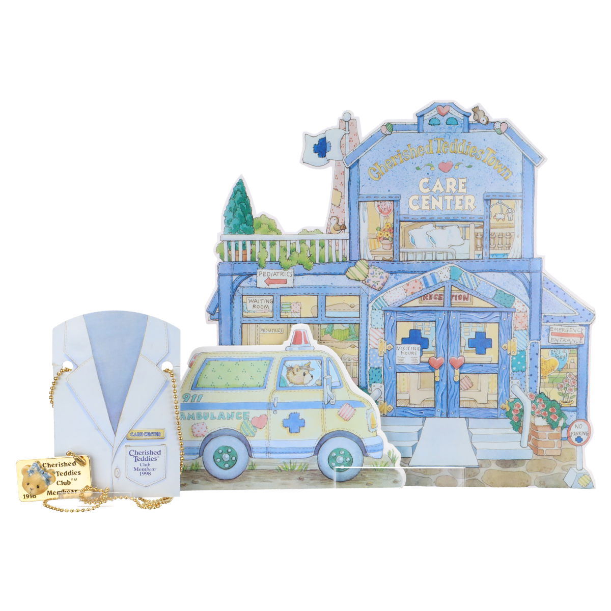 Kulisse Krankenhaus mit Krankenwagen aus Pappe modell CRT 466#Kette mit Namensschild Modell CRT 442#Figur Dr. Darlene Makebetter CT004; Höhe 6,5 cm#Figur Wade Weathersbee CT 982;Höhe 7 cm#Figur Lela Nightengale CT981; Höhe 8,8 cm